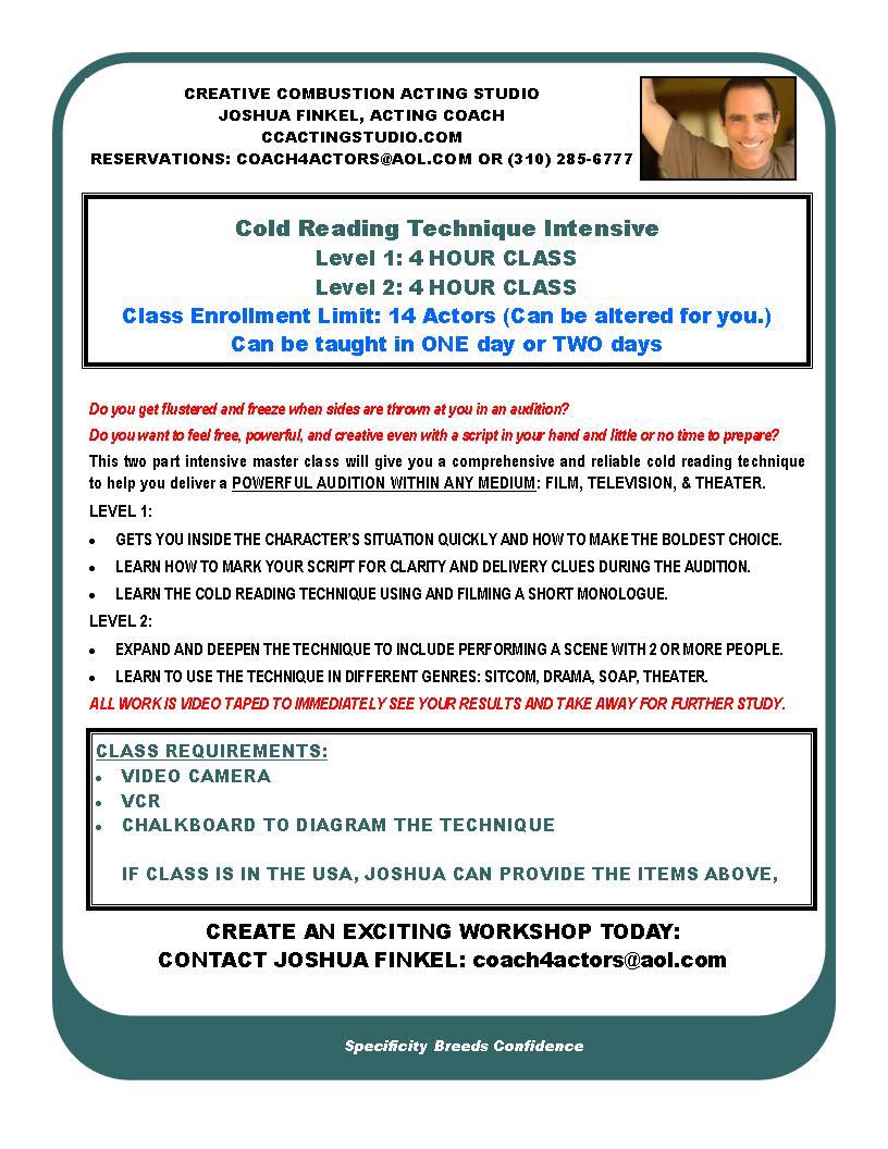 "Joshua Finkel's Cold Reading Workshop is a MUST for any aspiring and even professional actors out there auditioning. Whether you are auditioning for a musical, drama, TV show, sit-com, this technique is amazing. Joshua's class This technique WILL GIVE YOU THE EDGE OVER YOUR COMPETITION. Even if you've taken a million acting classes, the Cold Reading Technique will greatly enhance your auditioning skills. Joshua is a great teacher, and his class is very well structured and developed. He will take you through all the steps you need to use at your audition in order to nail your cold reading. From the beginning level through to the more advanced class I saw a vast improvement in everyone's "audition" and their ability to lift the words off of the page and bring the scene and the character to life. I cannot recommend this class enough to all especially if you are serious about your career and making it as an actor."